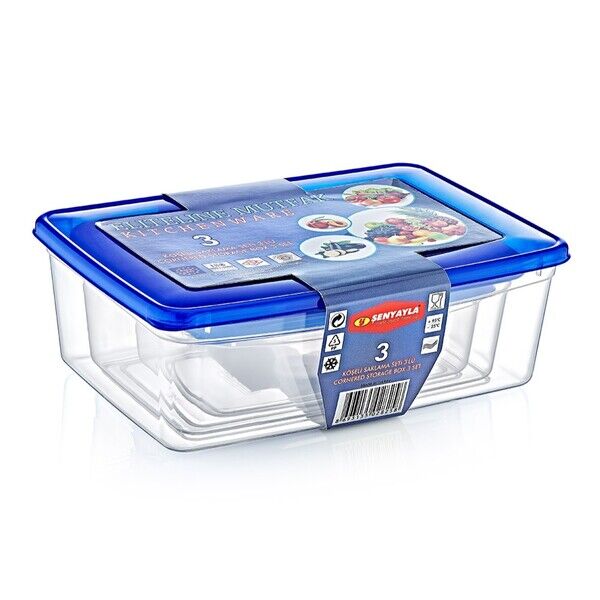 Mutfakta düzeni ve hijyeni ön planda tutanlar için ideal olan 3’lü Köşeli Saklama Kabı Seti, farklı boyutlardaki üç ayrı kutusuyla geniş bir kullanım alanı sunar. Set içerisinde 20x13,5x7 cm, 24x16,5x8,5 cm ve 27,5x19,5x9,5 cm boyutlarında üç adet saklama kabı bulunur.Her biri şeffaf gövdesi sayesinde içerisindekileri kolayca görmenizi sağlar. Sızdırmaz mavi kapakları, gıdaların tazeliğini uzun süre korur ve dolaplarda, buzdolabında ya da derin dondurucuda güvenle kullanılabilir. BPA içermeyen dayanıklı plastikten üretilmiştir, gıda ile temasa uygundur. Hafif ve sağlam yapısı sayesinde taşıması kolaydır.Bu set; yemek, salata, kahvaltılık, meyve veya atıştırmalıklarınızı muhafaza etmede mükemmel bir yardımcıdır. Aynı zamanda piknik ve seyahatlerde pratik bir çözüm sunar.