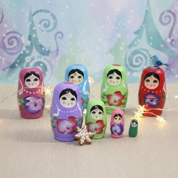 Bu şık ve el yapımı Matruşka seti, ev dekorasyonunda veya koleksiyonluk ürün olarak kullanılabilir.