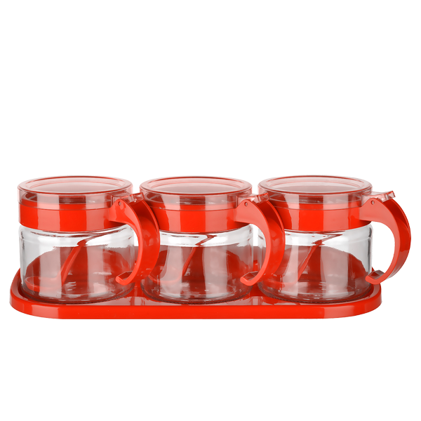 1 Adet 3lü kapaklı cam baharatlık, 3 adet plastik baharat kaşığı, 1 adet baharatlık standı