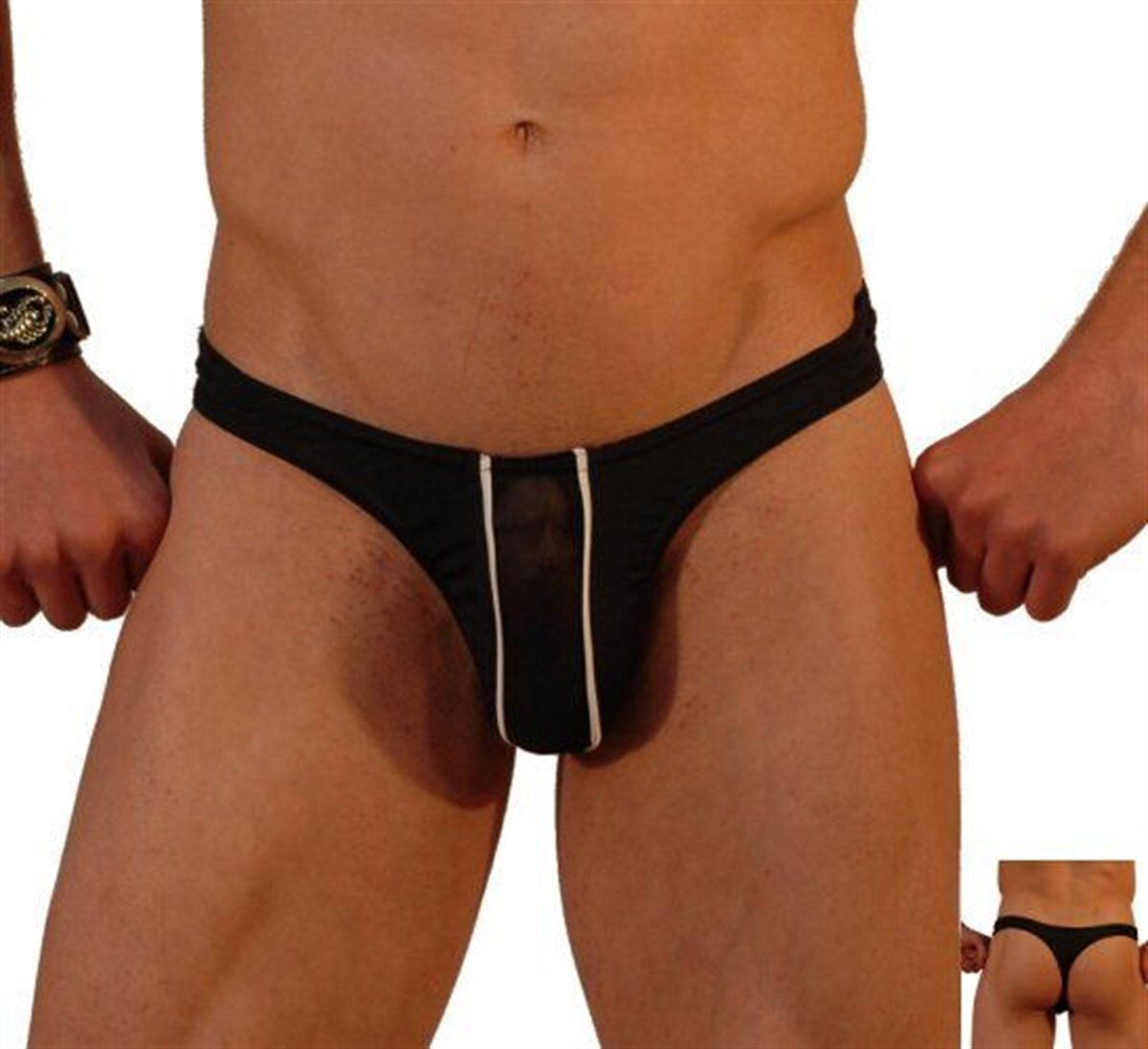 Seksi Önü şeritli ve transparan diğer bölümler esnek mikro kumaştan üretilmiştir. Fantazi erkek tanga.