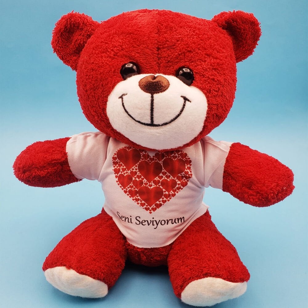 25 cm boyutundaki bu kırmızı peluş ayıcık, yumuşacık yapısı ve sevimli görünümü ile dikkat çeker. Kaliteli peluş malzemeden üretilmiş olan ürün, özel tişörtü ile birlikte gönderilir. Tişörtün üzerinde büyük kalp motifi ve "Seni Seviyorum" yazısı yer almaktadır. Duygusal ve anlamlı bir hediye alternatifi olan bu peluş oyuncak, sevdiklerinize olan duygularınızı ifade etmenin en tatlı yollarından biridir. Tişörtler ayıcığa giydirilmeden, ayrı olarak paketlenmiş şekilde gönderilmektedir.