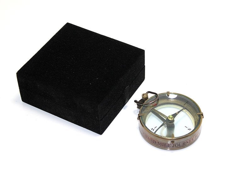 Bu şık pirinç pusula, "A THOUSAND MILE JOURNEY BEGINS WITH ONE STEP" (Bin Millik Yolculluk Bir Adımla Başlar) yazısı ile özel bir tasarıma sahiptir. Pirinç malzemeden yapılmış olan pusula, vintage tarzıyla hem dekoratif hem de fonksiyoneldir. Sağlam yapısı ve etkileyici yazısı ile hem ofis hem de ev dekorasyonunu tamamlayacak bir parçadır.