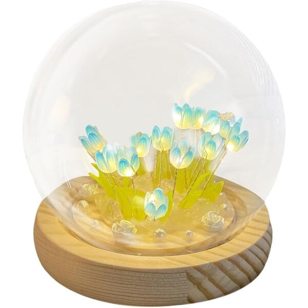 LED IŞIKLI LALE CAM KÜREÜrün ÖzellikleriŞeffaf cam fanus, yapay lale çiçekleri, kristal taşlar ve ahşap taban ile hazırlanmış bu dekoratif ürün, tamamen hazır halde gönderilmektedir. İçerisindeki lale çiçekleri ve kristal taşlar özenle yerleştirilmiş olup, kullanıcıdan herhangi bir kurulum veya düzenleme gerektirmez. LED ışıklarla donatılmış yapısı sayesinde sıcak ve yumuşak bir ışık yayarak bulunduğu ortama hoş ve huzurlu bir atmosfer kazandırır.Kompakt boyutu sayesinde masa, raf, komodin veya yatak odası dekorasyonu için ideal bir kullanım sunar. Ev dekorasyonunda, romantik sürprizlerde, özel günlerde hediye alternatifi olarak veya gece lambası amacıyla rahatlıkla tercih edilebilir. Düşük enerji tüketimine sahip LED ışıkları uzun ömürlü kullanım sağlarken, modern ve zarif tasarımı her türlü yaşam alanına uyum gösterir.