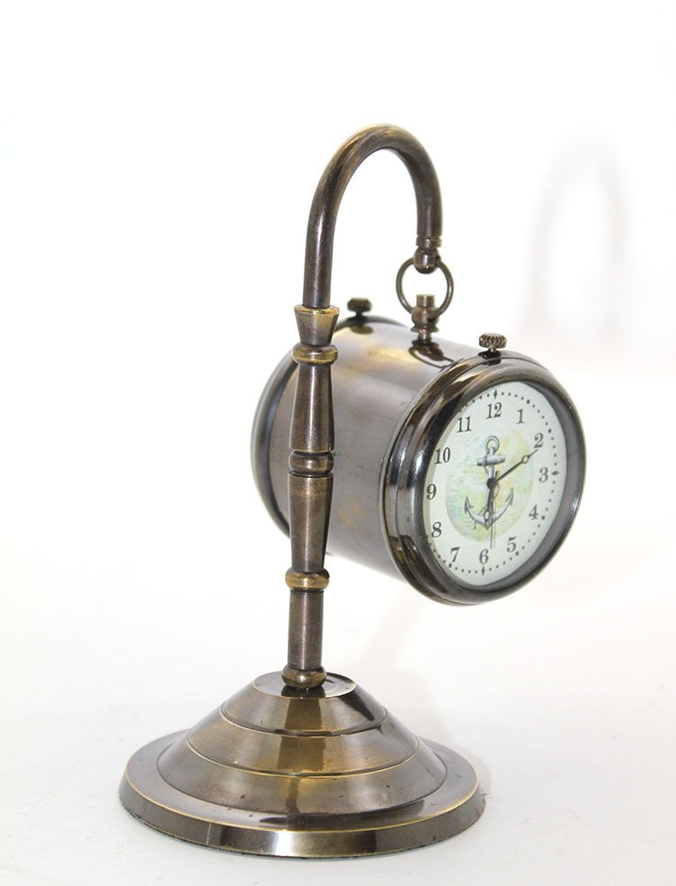 Pirinçten üretilmiş, şık bir tasarıma sahip masa saati. 12 saatlik formatta bir kadrana sahip olan bu saat, antik denizci saatine benzer bir tasarımla dekorasyonunuza zarif bir dokunuş katacaktır. Hem estetik hem de işlevsel olan bu masa saati, ofis veya ev kullanımına uygundur.