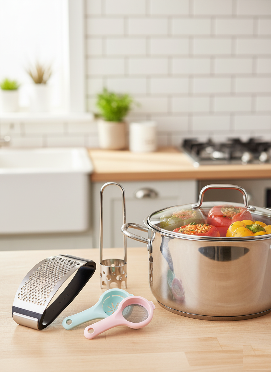 Sarımsak ezici, biber & kabak oyacağı, yumurta akı ayırıcı ve 2’li çay süzgeci ile yemek hazırlığı artık hızlı ve zahmetsiz. Dayanıklı, paslanmaz ve kolay temizlenir. Mutfakta zaman kazanın, lezzeti artırın!