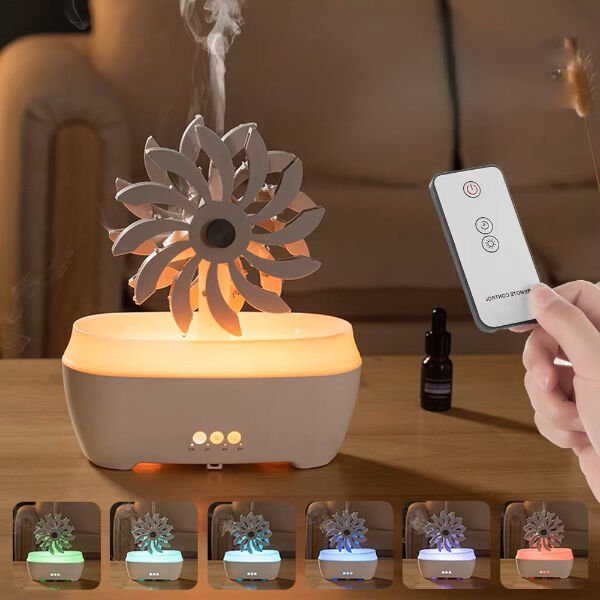 Rüzgar değirmeni tasarımlı hava nemlendirici 300 ml su haznesiyle ortama ideal nem dengesini sağlar. Uzaktan kumandası sayesinde kolayca kontrol edilebilir ve RGB ışık fonksiyonlarıyla farklı renklerde hoş bir ambiyans yaratır. Aromatik yağlarla kullanılabilen cihaz, bulunduğu ortama ferahlık ve hoş koku katar. Üst kısmındaki dekoratif değirmen yavaşça hareket ederek görsel bir şıklık sunar. Sessiz çalışmasıyla uyku sırasında veya çalışma ortamında rahatsızlık vermez, aynı zamanda dekoratif tasarımıyla ev ve ofislerde modern bir görünüm sağlar.