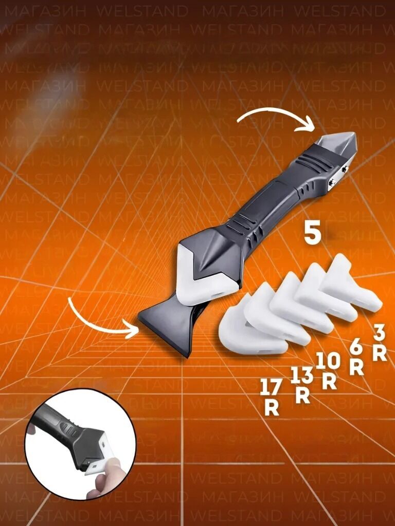 DEĞİŞTİRİLEBİLİR SİLİKON PEDLER: Farklı boyut ve yarıçapa sahip 5 adet değiştirilebilir silikon kafa ile birlikte gelir. Harç aleti kaymaz bir tasarıma sahiptir. Silikon sökücü aracı mutfak, duş, küvet, fayans, kapı, pencere, lavabo, derz dolgu bitirme ve daha fazlasında kullanılabilir. 3R, 6R, 10R, 13R ve 17R dahil olmak üzere farklı yarıçaplı kapaklara sahip 5 değiştirilebilir ped ile birlikte gelen Kaymaz sap ile tasarlanmıştır