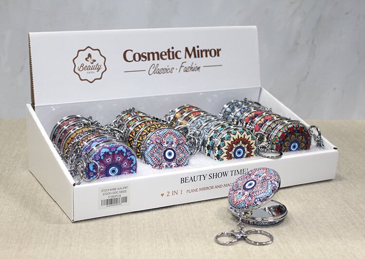 TAŞLI EL AYNASI ANAHTARLIK MODEL 2 Ürün ÖzellikleriTaşlı el aynası anahtarlık model 2, yuvarlak model ve nazar boncuğu baskılı renkli tasarımı ile şık ve dekoratif bir aksesuardır. Göz alıcı taş detayları ve renkli nazar boncuğu baskısı, aynayı estetik bir şekilde süsler ve hem işlevsel hem de dekoratif hale getirir. Anahtarlık özelliği sayesinde, kolayca taşınabilir ve her zaman yanınızda taşımanız için uygundur. Kompakt boyutu ile çanta, cüzdan veya anahtar gibi aksesuarlarınızda rahatça taşıyabileceğiniz bu anahtarlık, hem günlük kullanım hem de hediye olarak mükemmel bir seçimdir.Paket İçeriği1 adet Taşlı El Aynası Anahtarlık Model 2
